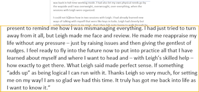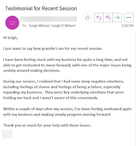 Using specialised techniques that I have developed and crafted over years, I have generally been able to help professionals like you quickly let go of their feelings of being stuck in four sessions or less, all from the comfort of your home or office, over Zoom. Sometimes it only takes one session!